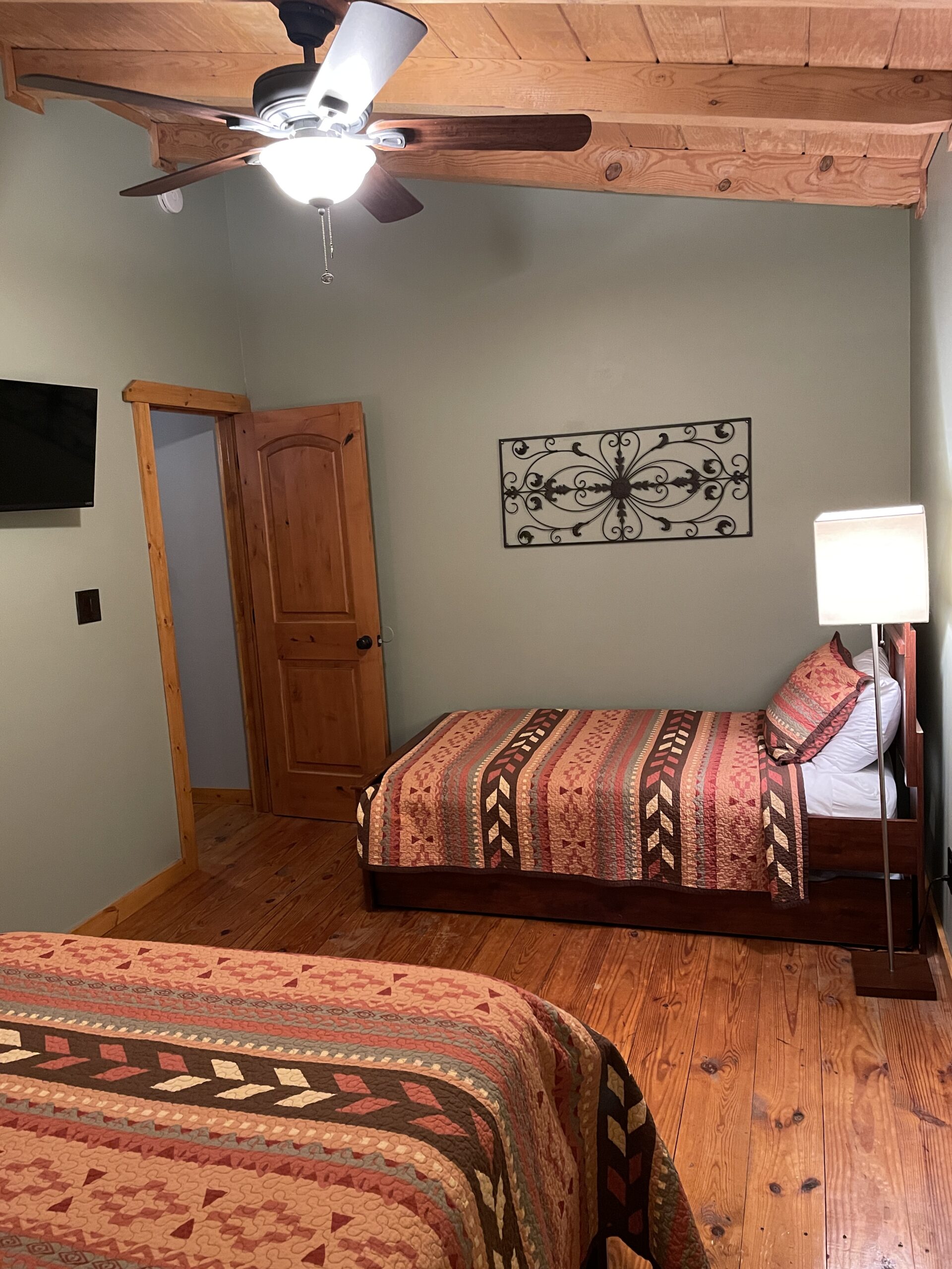 Deer Run: Unwind, relax, and enjoy nature at its best! This cabin is equipped with WiFi, High Speed Internet, 4 Smart TV’s, central heat/air conditioning, and propane gas grill. We supply bedding (sheets, blankets, and pillows). The main floor offers a large family room with a can beverage cooler, eating area, and kitchen. The kitchen is complete with stove/oven, microwave, toaster oven, 4-slice toaster, drip coffee and Keurig coffee maker. Washer/Dryer is available on main floor along with iron/ironing board.. The master bedroom is on the main floor with a King size bed. A bathroom is also located on the main floor. The 2nd floor offers two bedrooms (1st bedroom has 1 full bed and a twin trundle bed) & (2nd bedroom has 2 twin beds). A bathroom is also located on the 2nd floor.