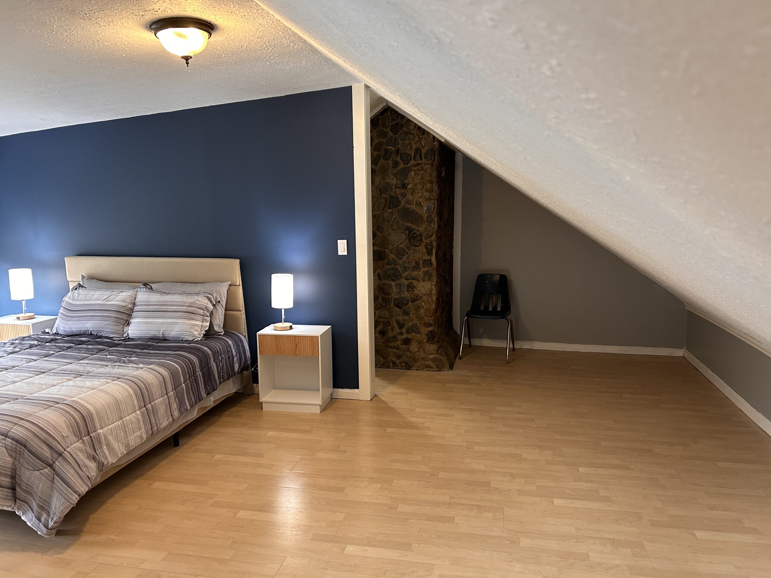 The master bedroom—complete with a queen-size bed and a cozy fireplace—offers the perfect space to unwind after a day on the lake. A full bathroom is also on the main floor. Upstairs, the second floor includes two additional bedrooms, each with a queen bed.